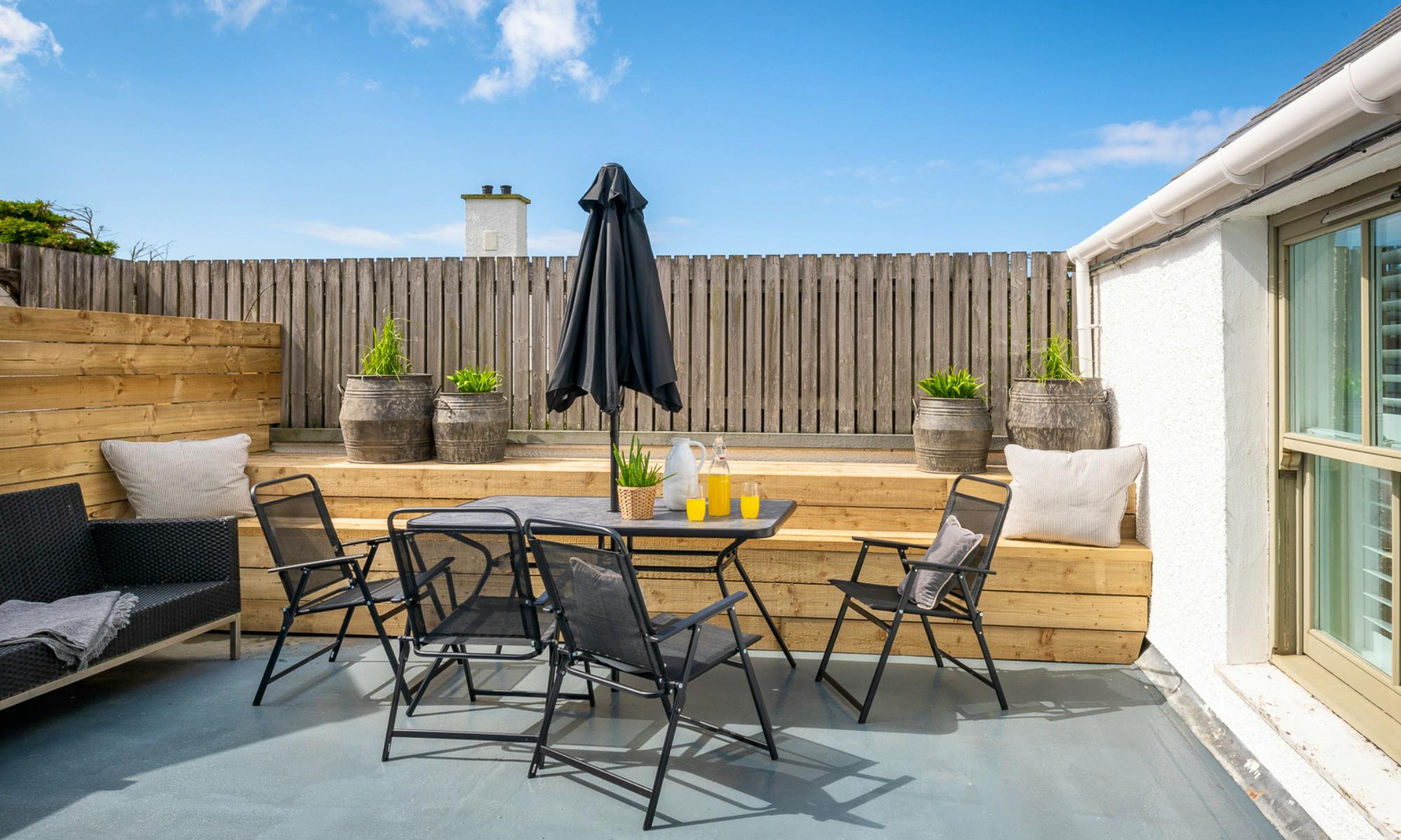 Yes, the property has a spacious wrap-around garden with a chiminea and balcony with sea views.