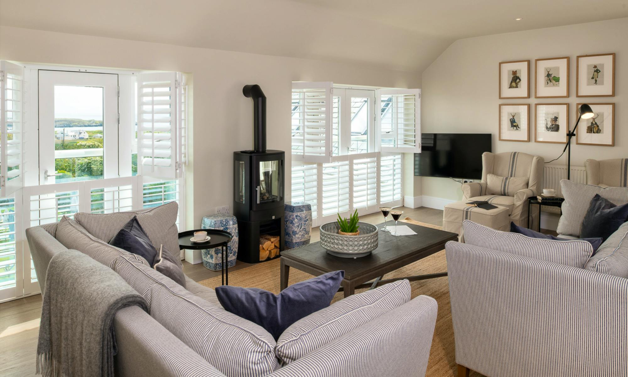 Head upstairs to the showpiece – an open-plan living, dining and kitchen area bathed in natural light. This sociable hub has sleek Breville and Bosch appliances, an induction hob, filtered water taps and all you need for cooking and dining with ease. Gather at the dining table for laughter-filled meals, then move to the spacious lounge to cosy up with loved ones. From here, step out onto the balcony to soak up panoramic sea views that stretch across the Anglesey coastline – best enjoyed with morning coffee or an evening glass of wine.
