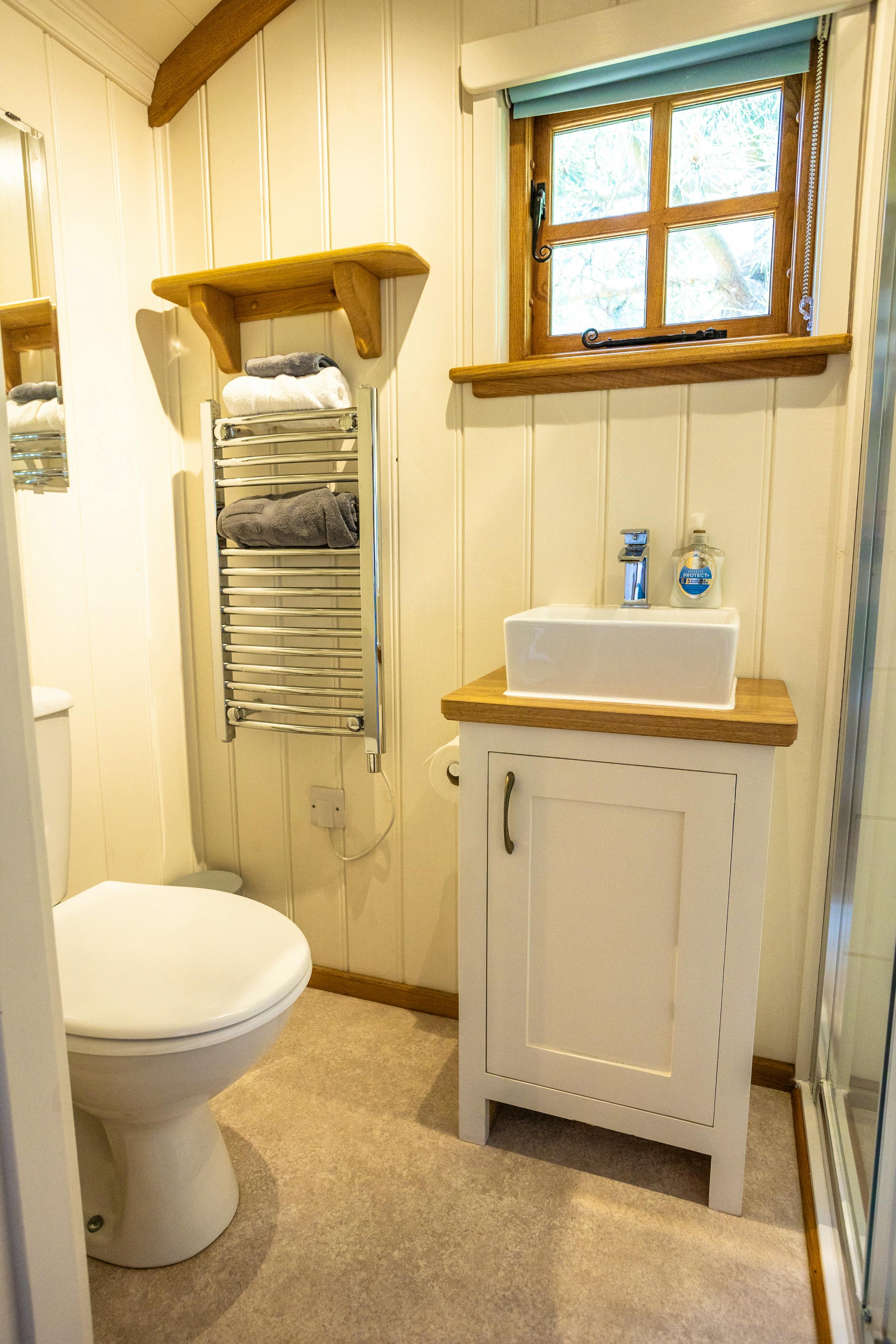 Each tent has its own ensuite bathroom fitted with a shower, toilet, sink, and towel rail for private use.