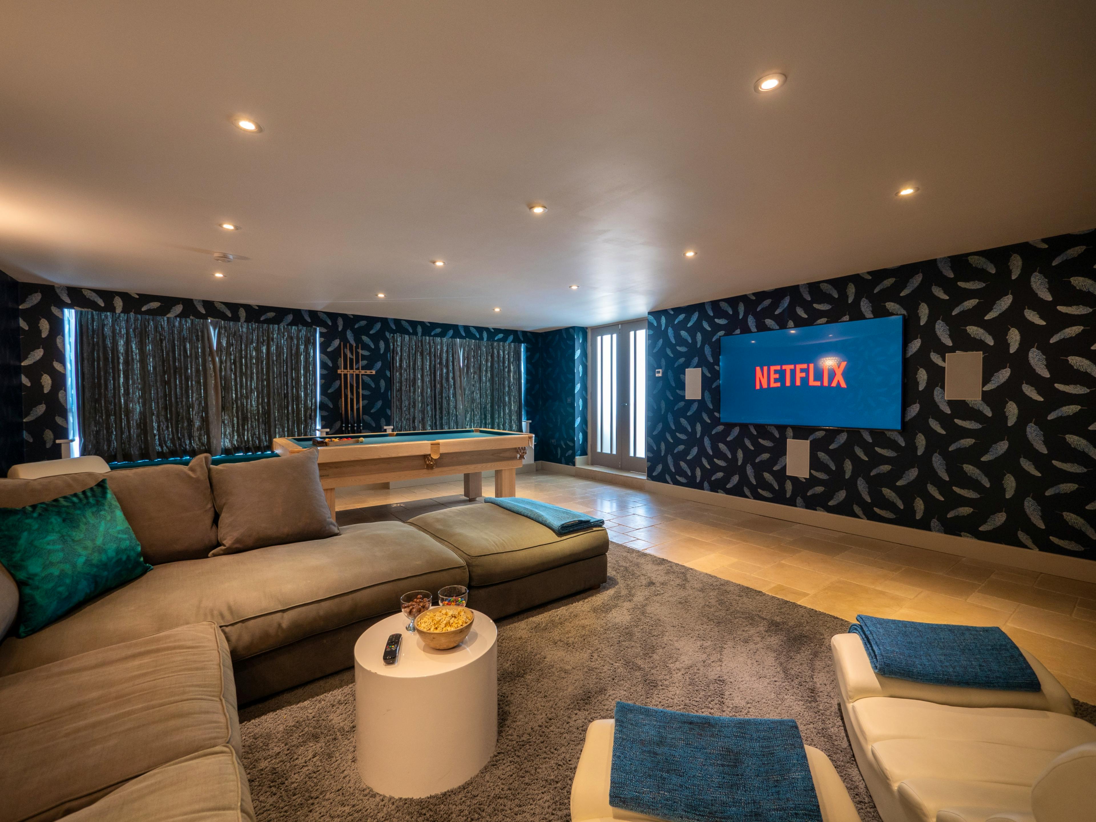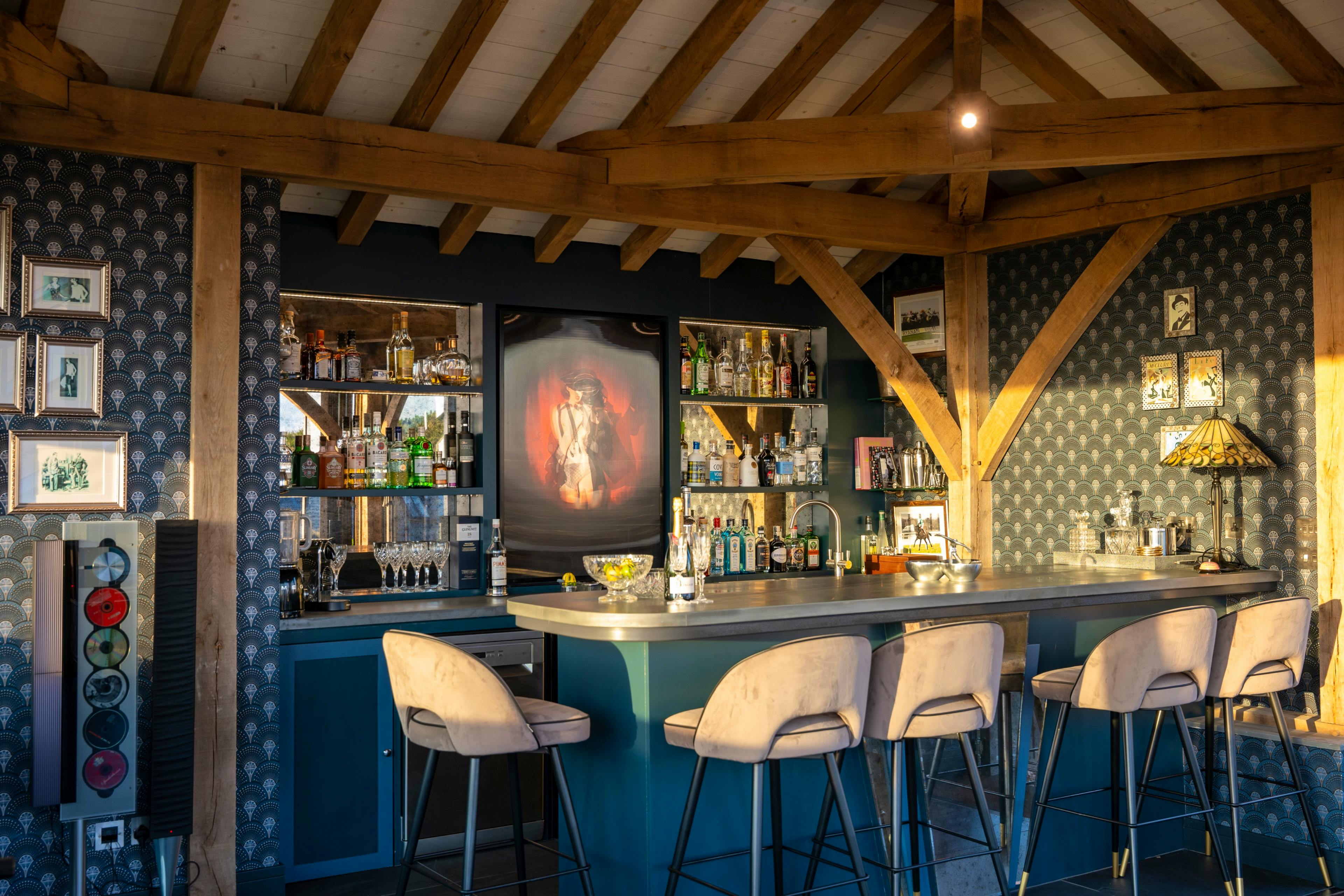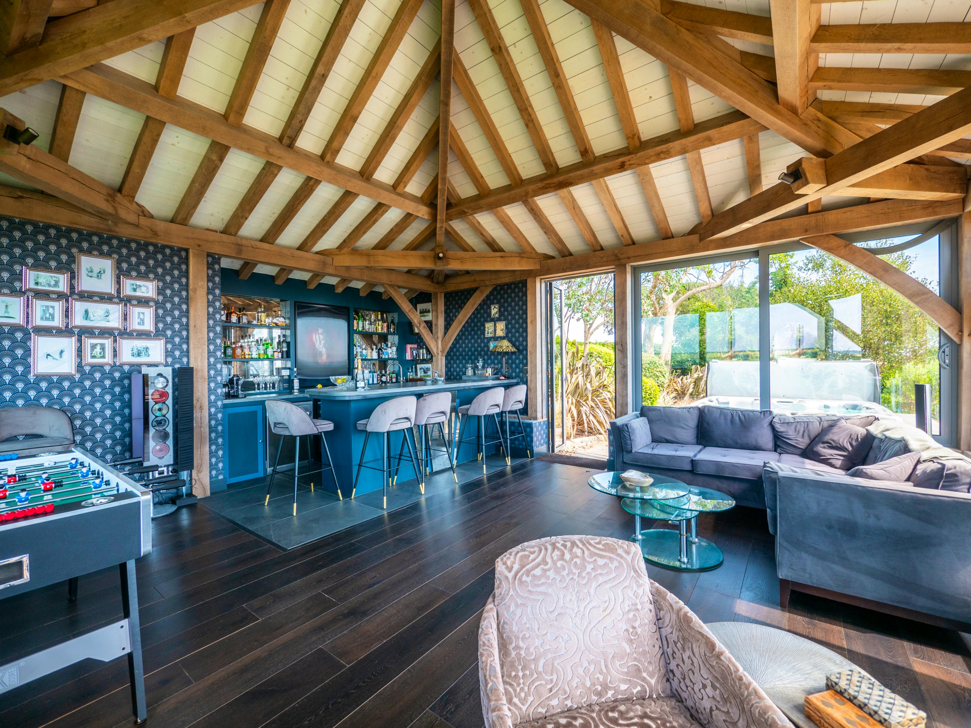 For entertainment, the cinema room offers a stylish setting with deep, rich colours and ambient lighting for the perfect movie night or a game of pool. Outside in the garden's highest point, Thurlestone’s first art-deco bar offers stunning views across the moors to the ocean, making it the best spot to enjoy a cocktail or nightcap. In summer, open the windows to take in the stunning sunsets, and in cooler months, light the log burner for a cosy atmosphere.