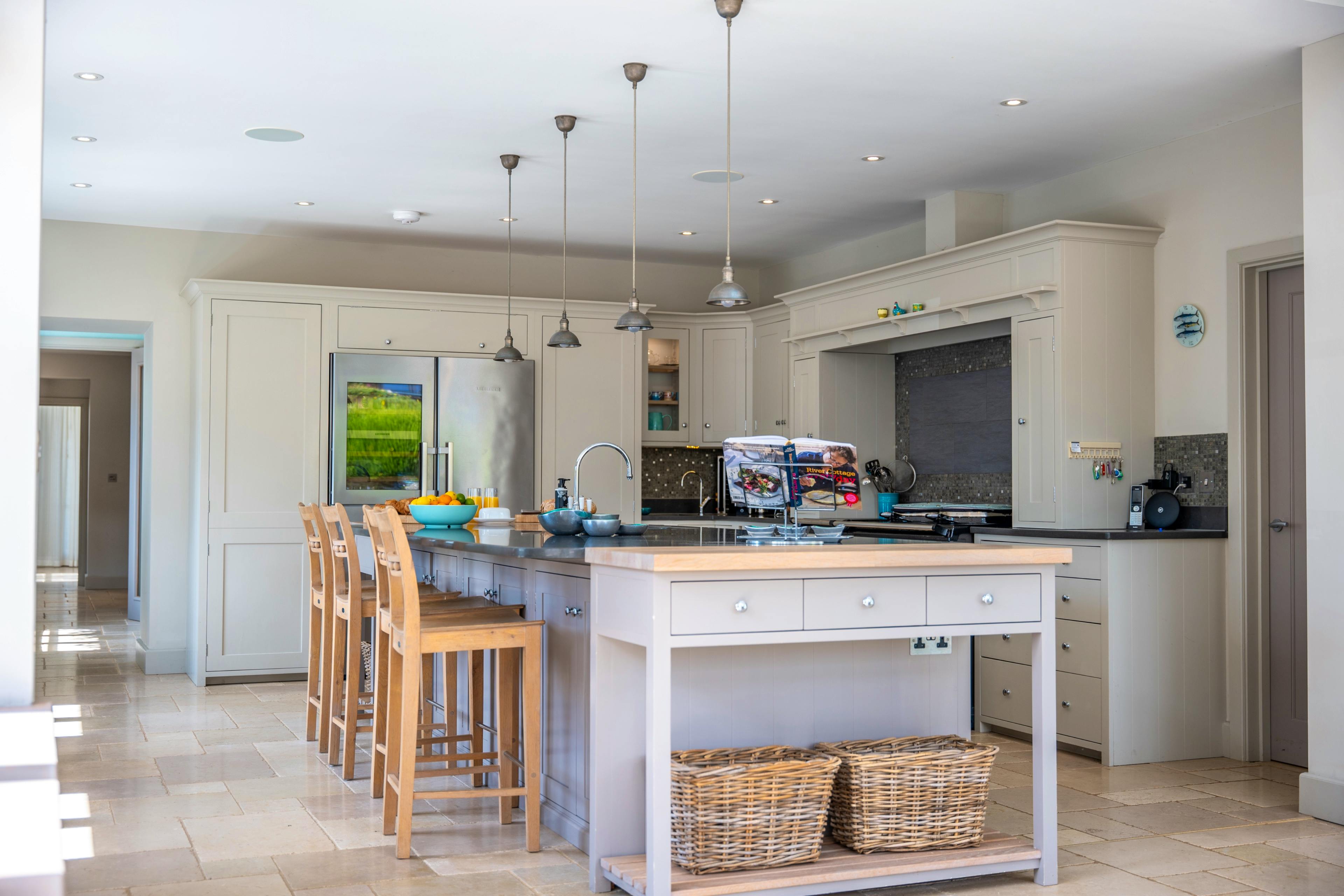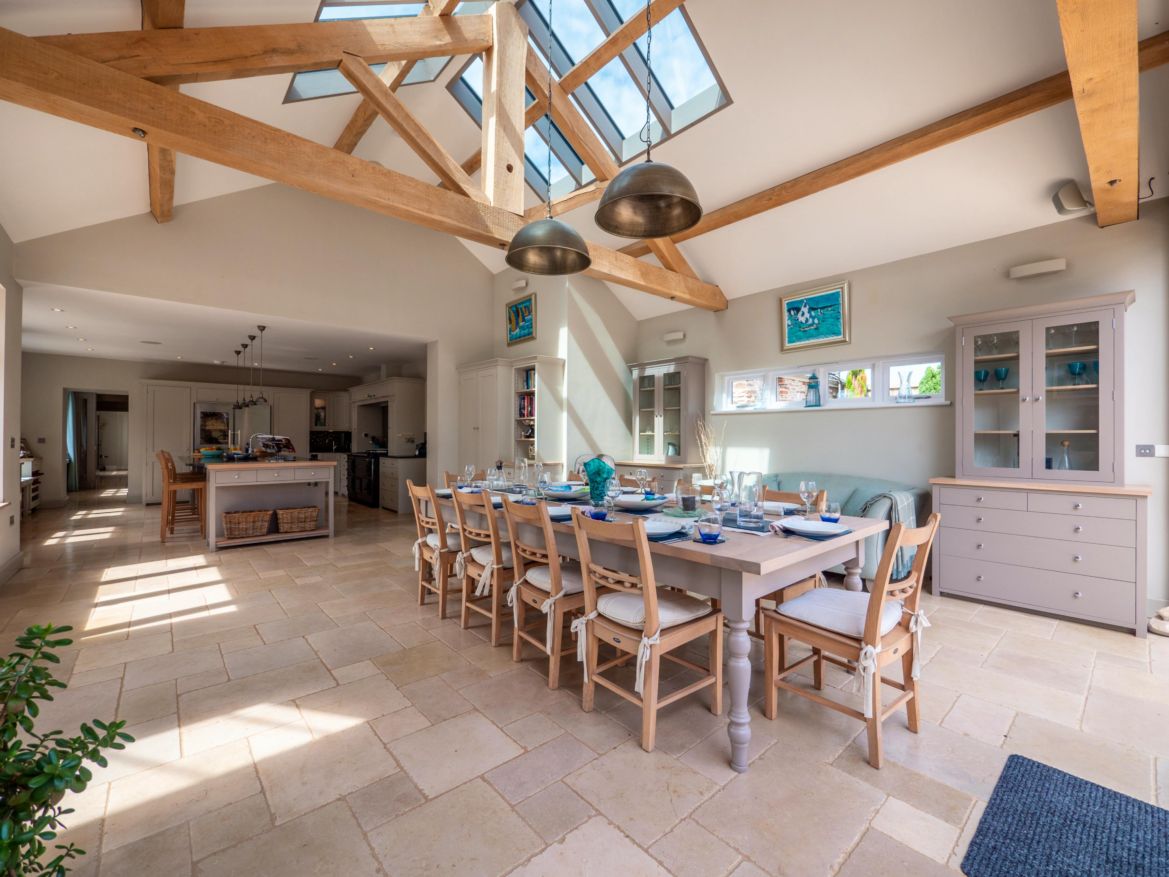 The heart of this farmhouse is its expansive kitchen, which flows effortlessly into an impressive double-height orangery framed by oak beams. This stunning space is a chef’s dream, featuring a four-oven Aga (guides provided for first-timers!), multiple fridge/freezers as well as wine racks and a temperature controlled wine fridge. During the warmer months, open the bi-fold doors to the Italian-inspired courtyard, where you can enjoy alfresco dining and make the most of the BBQ area.