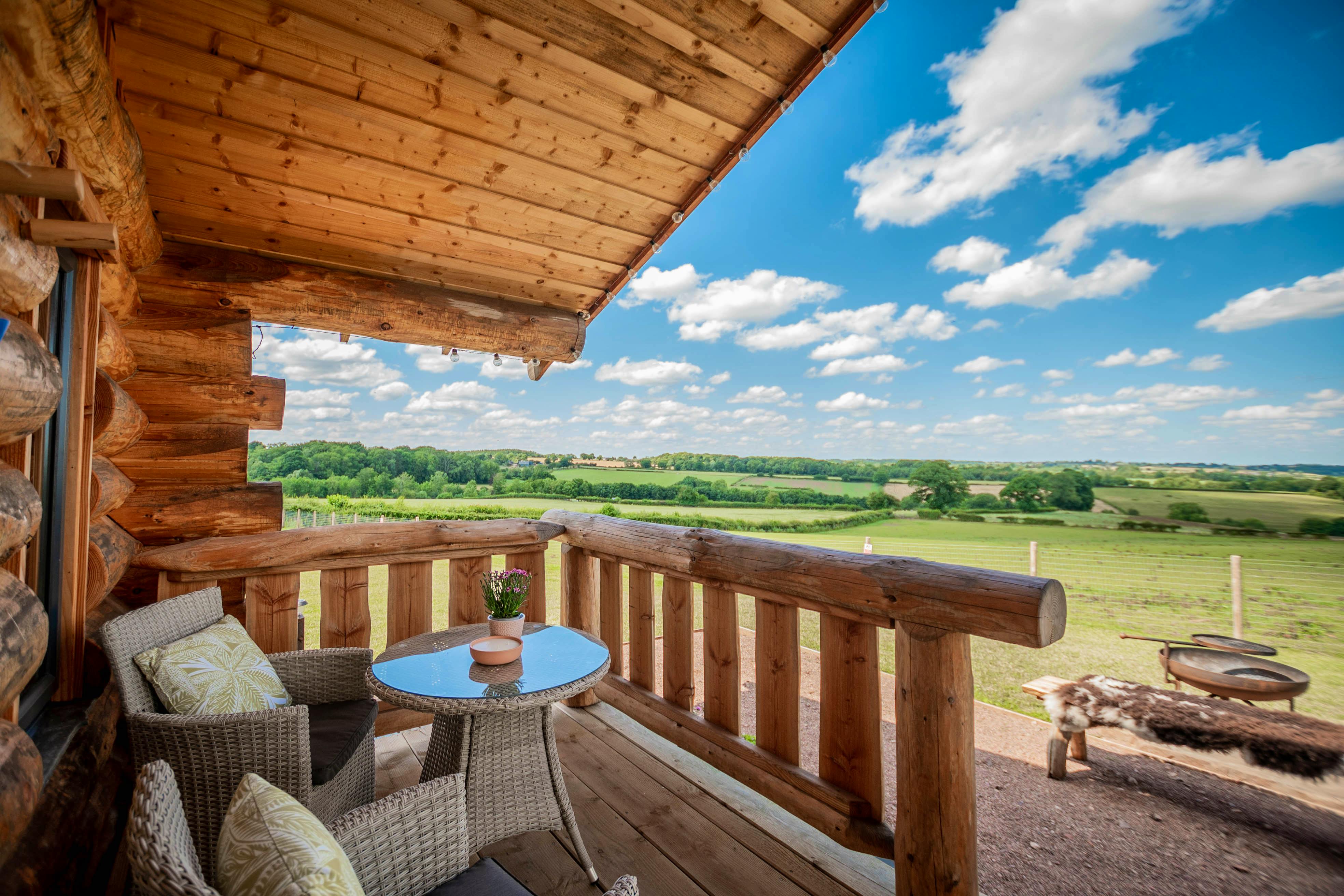 Gorgeous cabin for two with exclusive use of a sauna, hot tub, cinema and pizza oven, with amazing views of the surrounding Worcestershire countryside.