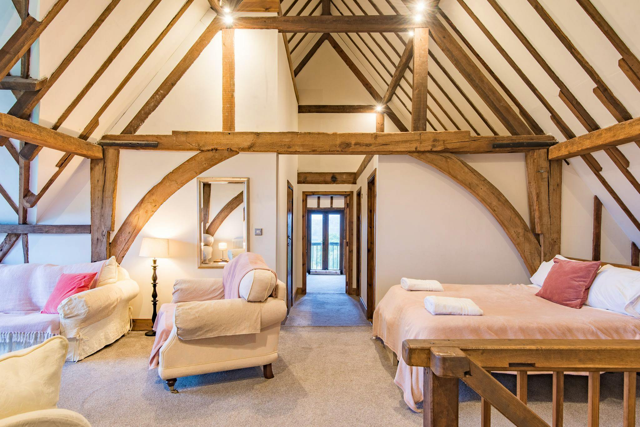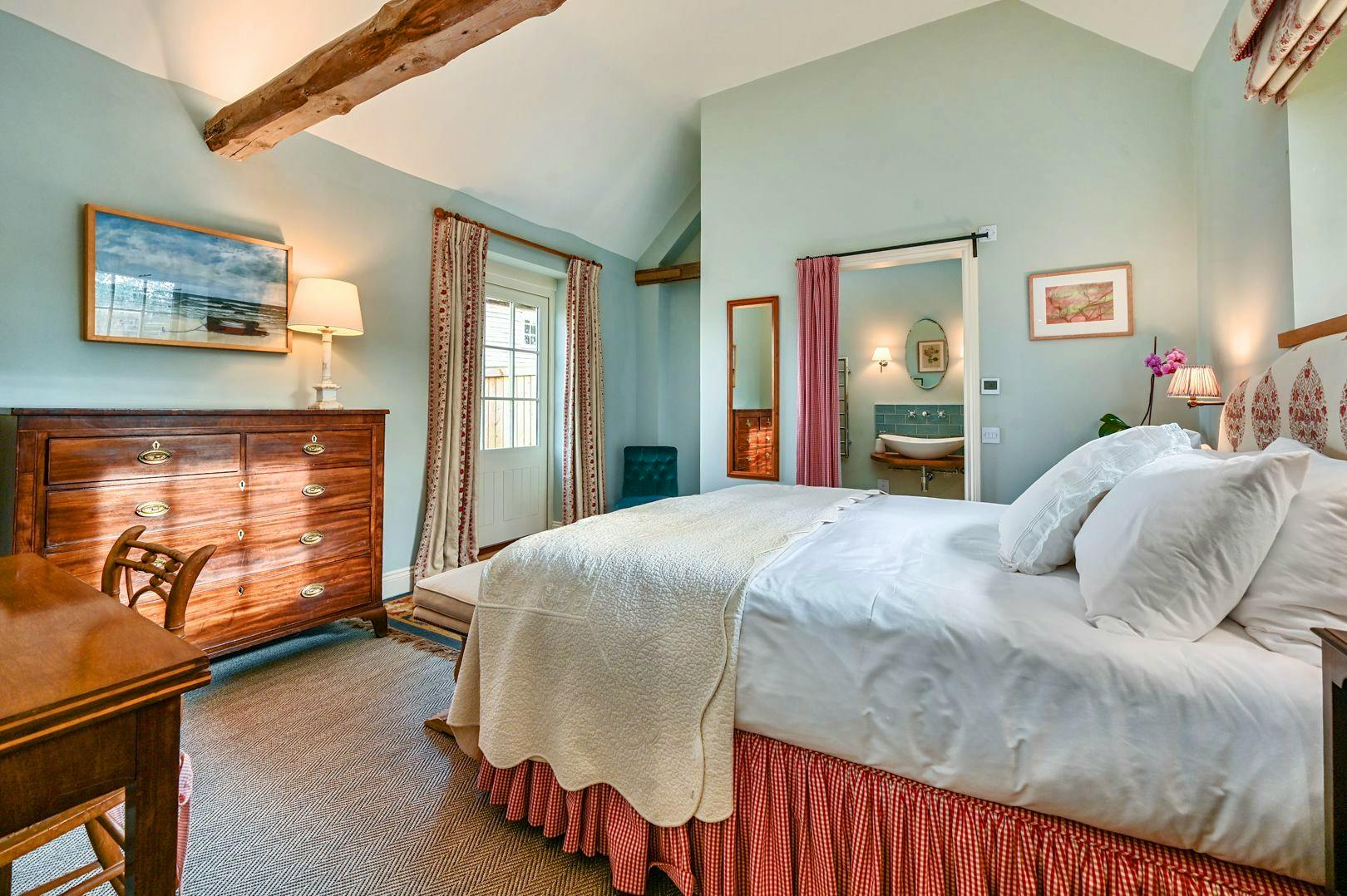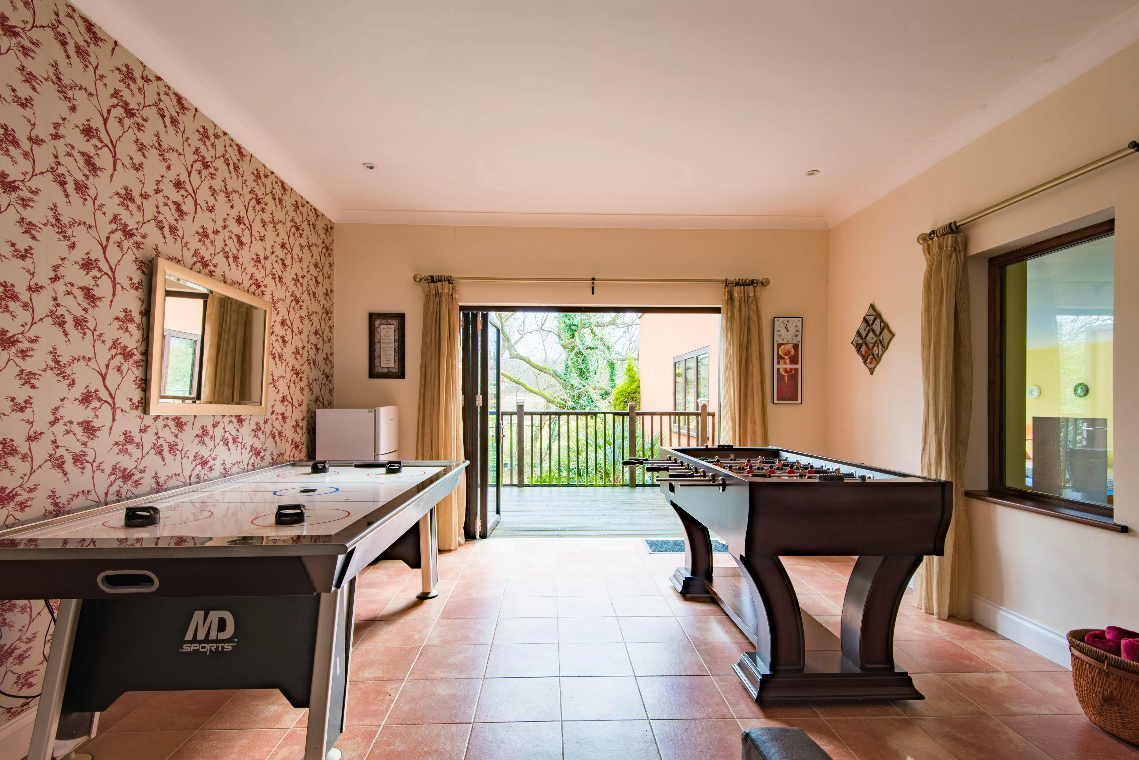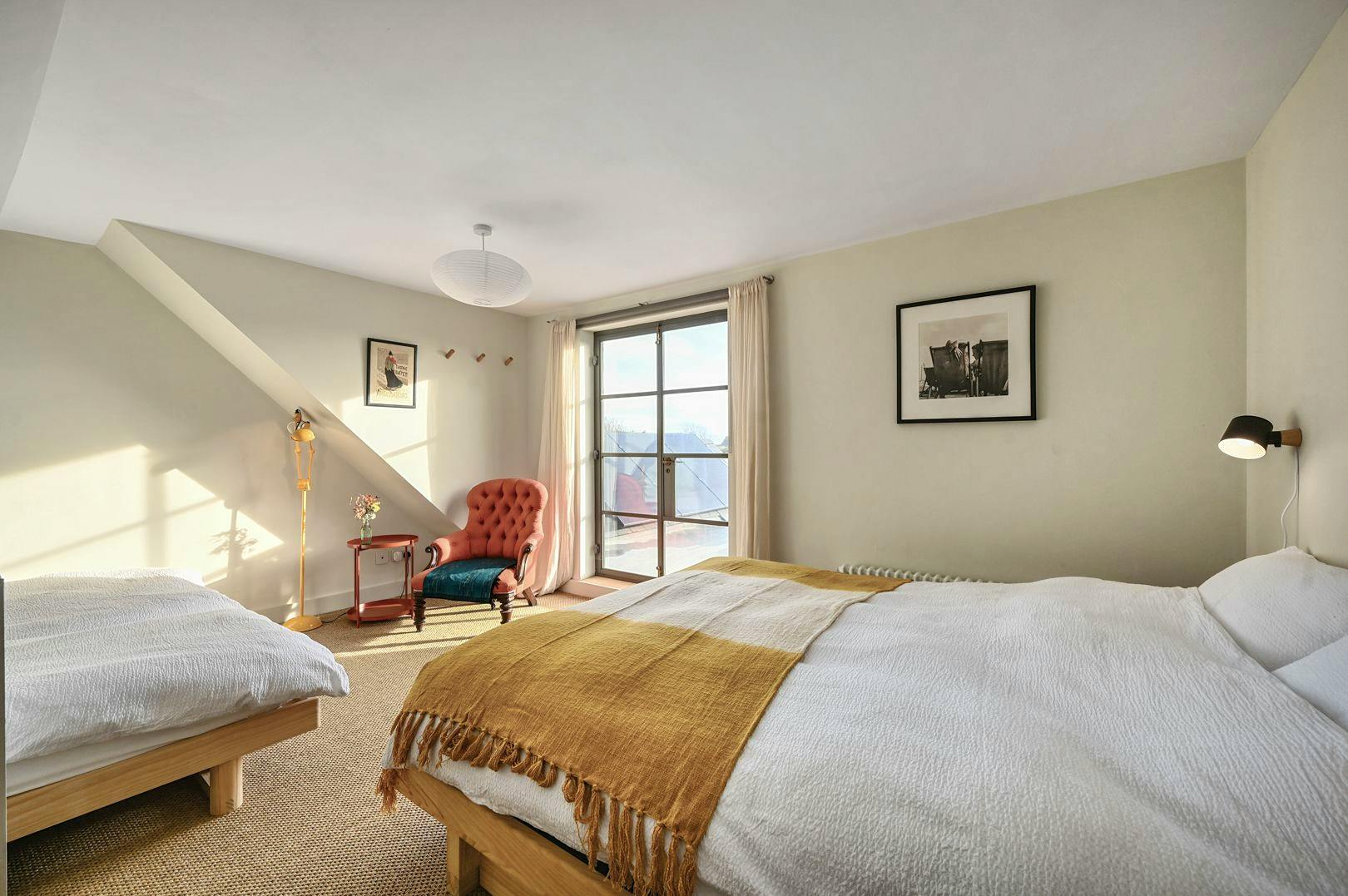 An exquisite glass atrium connects two double bedrooms, each adorned with unique, elegant details to enhance your well-being. The mezzanine master bedroom, occupying the top floor and featuring an ensuite bathroom, treats you to a breathtaking view across the sea to France. It also offers a front-row seat to the daily spectacle of surreal light shows during sunrise and sunset, right from the welcoming embrace of your bed.