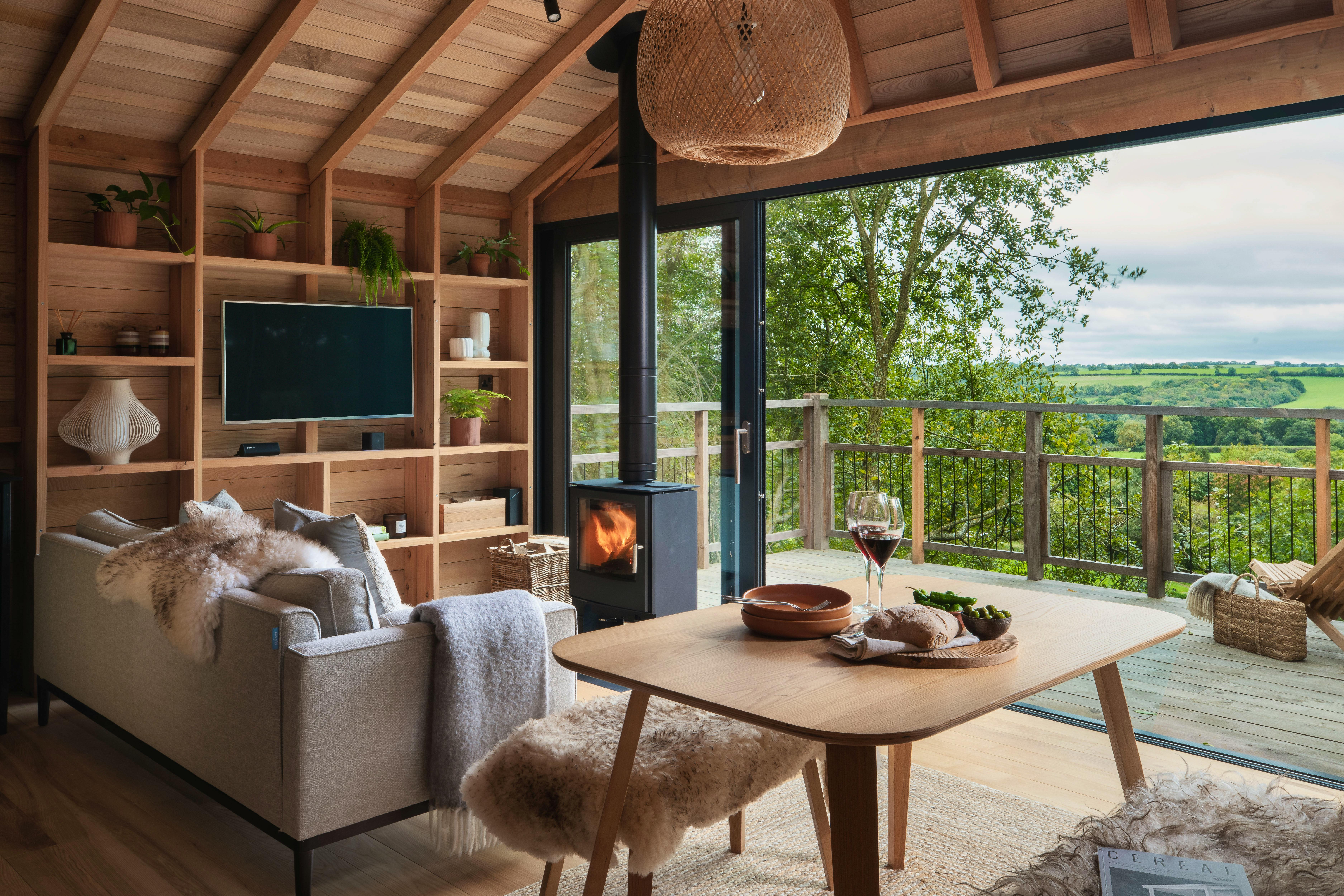 Beautifully designed to compliment the surrounding environment these delightful houses will instantly delight and inspire. The houses are reached via a decked walkway which climbs through the trees to the entrance. Built entirely from timber, jaws will drop when guests step inside the double height open plan kitchen and living area. Light streams in through the wall of windows which offer views of the tree canopy and across the fields beyond whilst illuminating this spacious area with natural light.