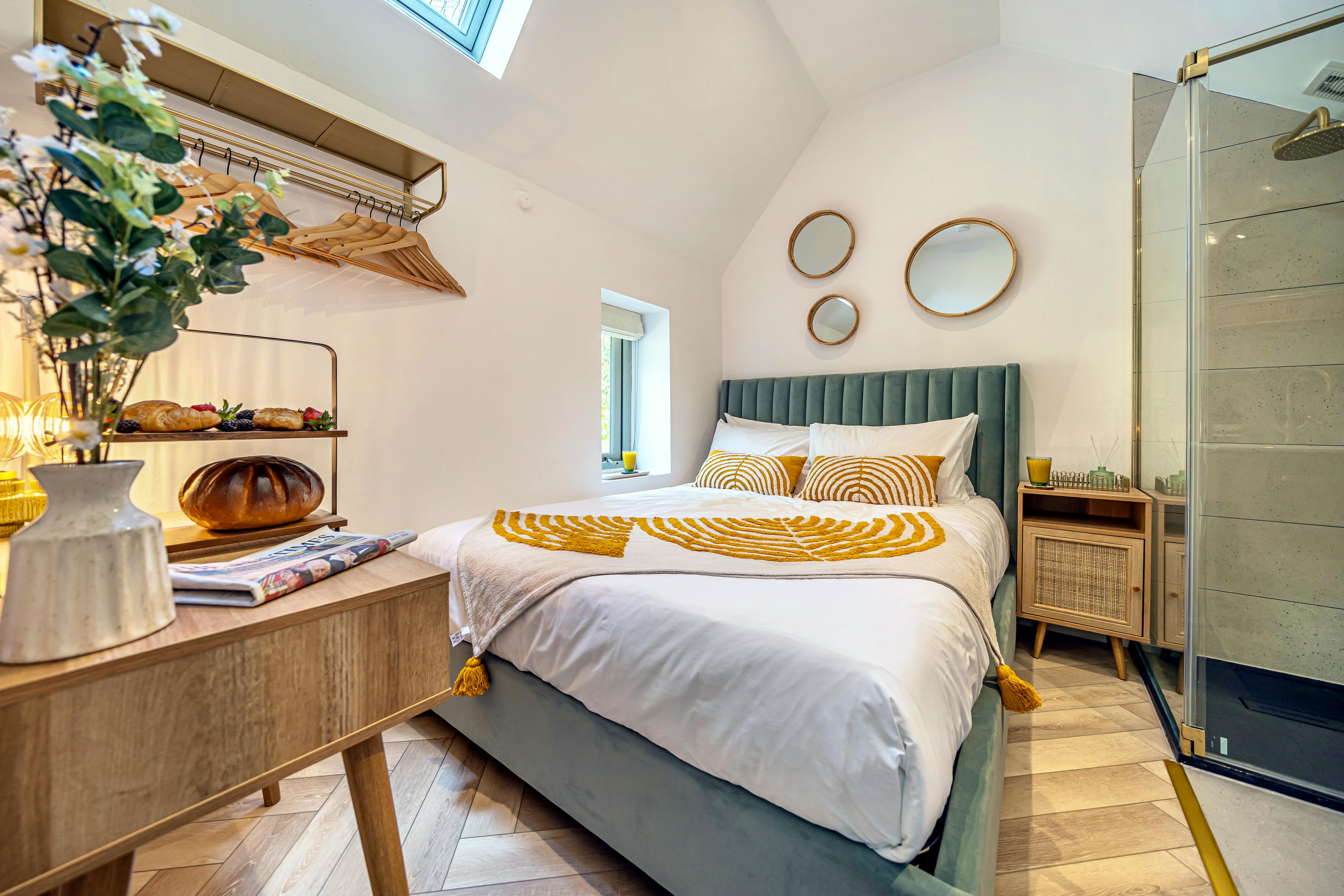 The light, airy and spacious double bedroom which also features a welcoming lounge area is an inviting space that is stylishly furnished with a comfortable sofa, natural materials and calming colourways. Patio doors open up to your private terrace to let in lots of natural light and provide a cooling breeze when left open in warmer weather. A large modern bathroom and adjoining shower are amply supplied with fluffy towels.