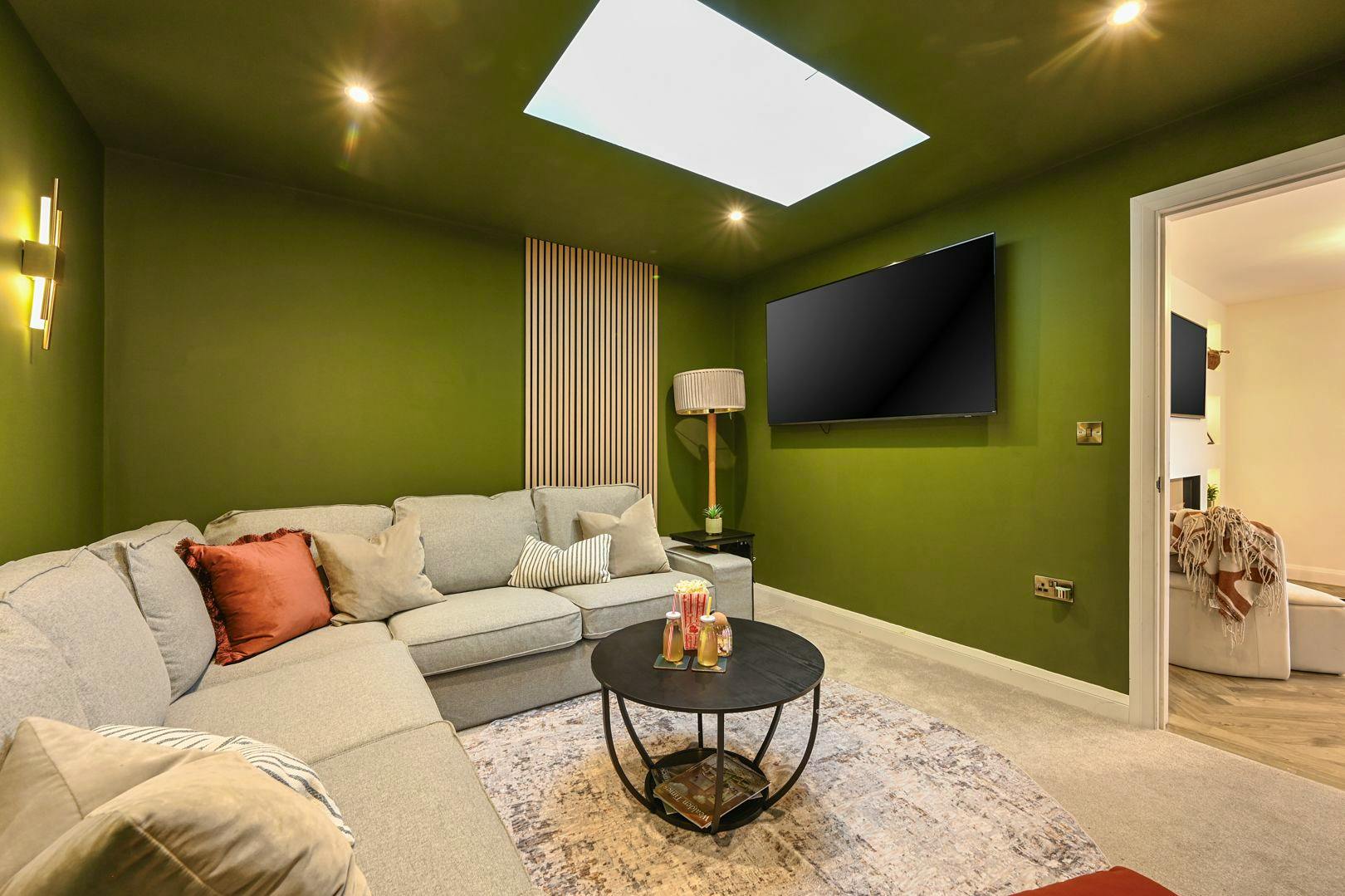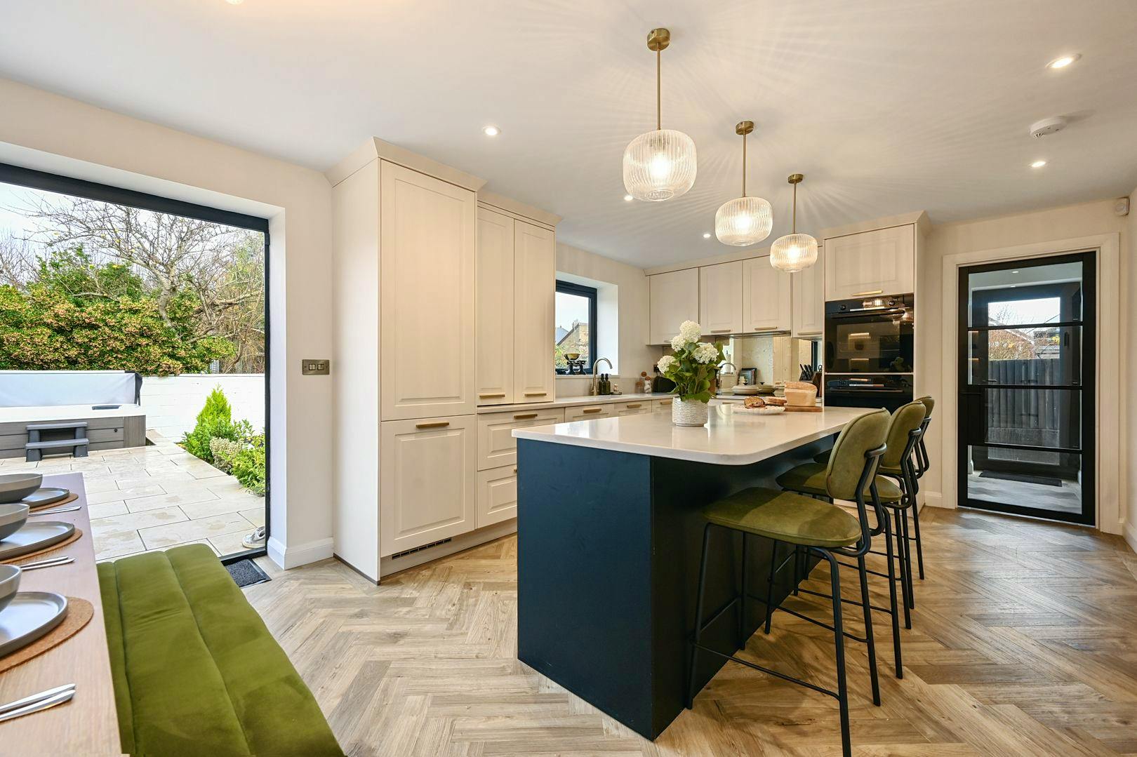 The kitchen includes an oven, hob, microwave, Nespresso machine, dishwasher, fridge and dining area for four.