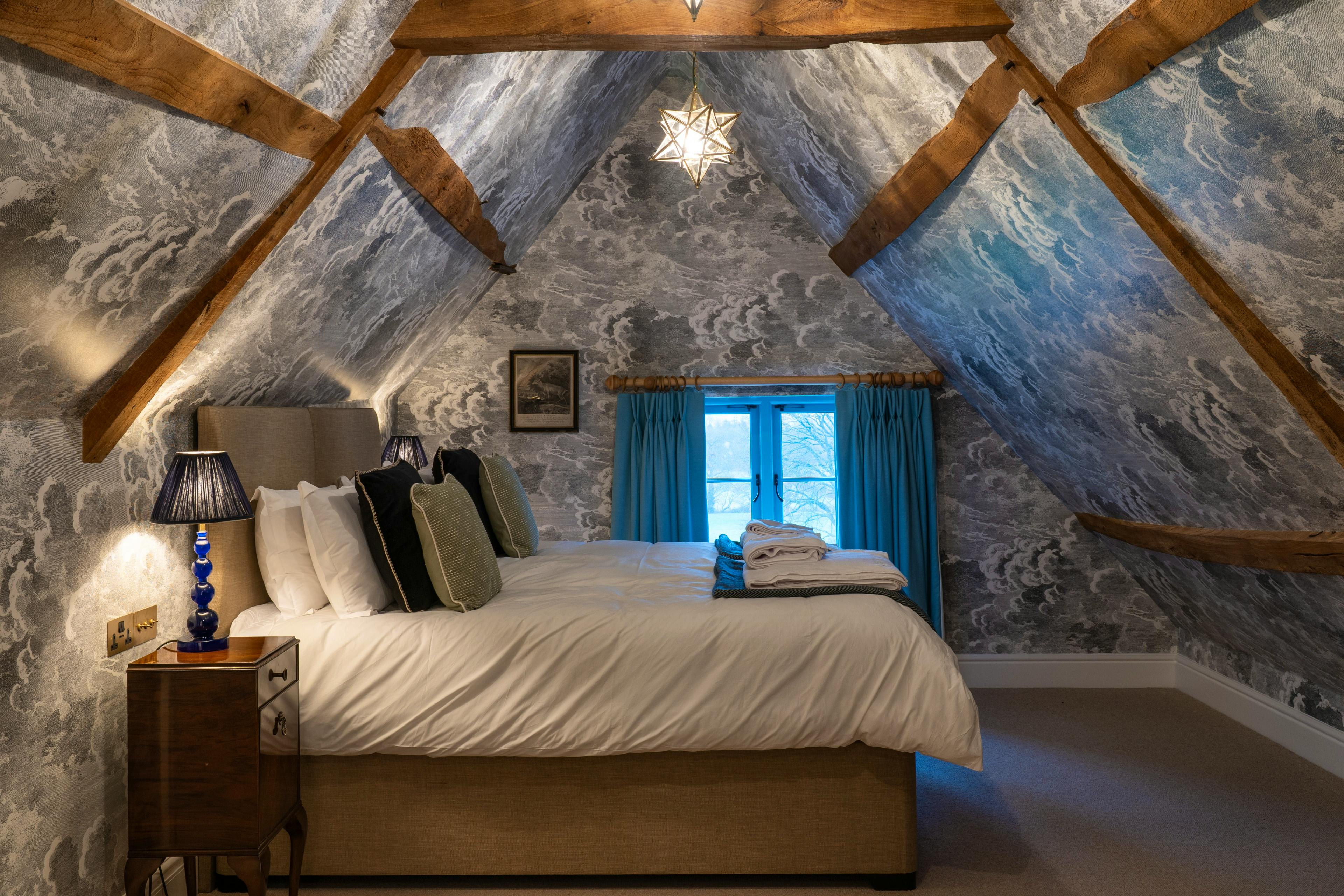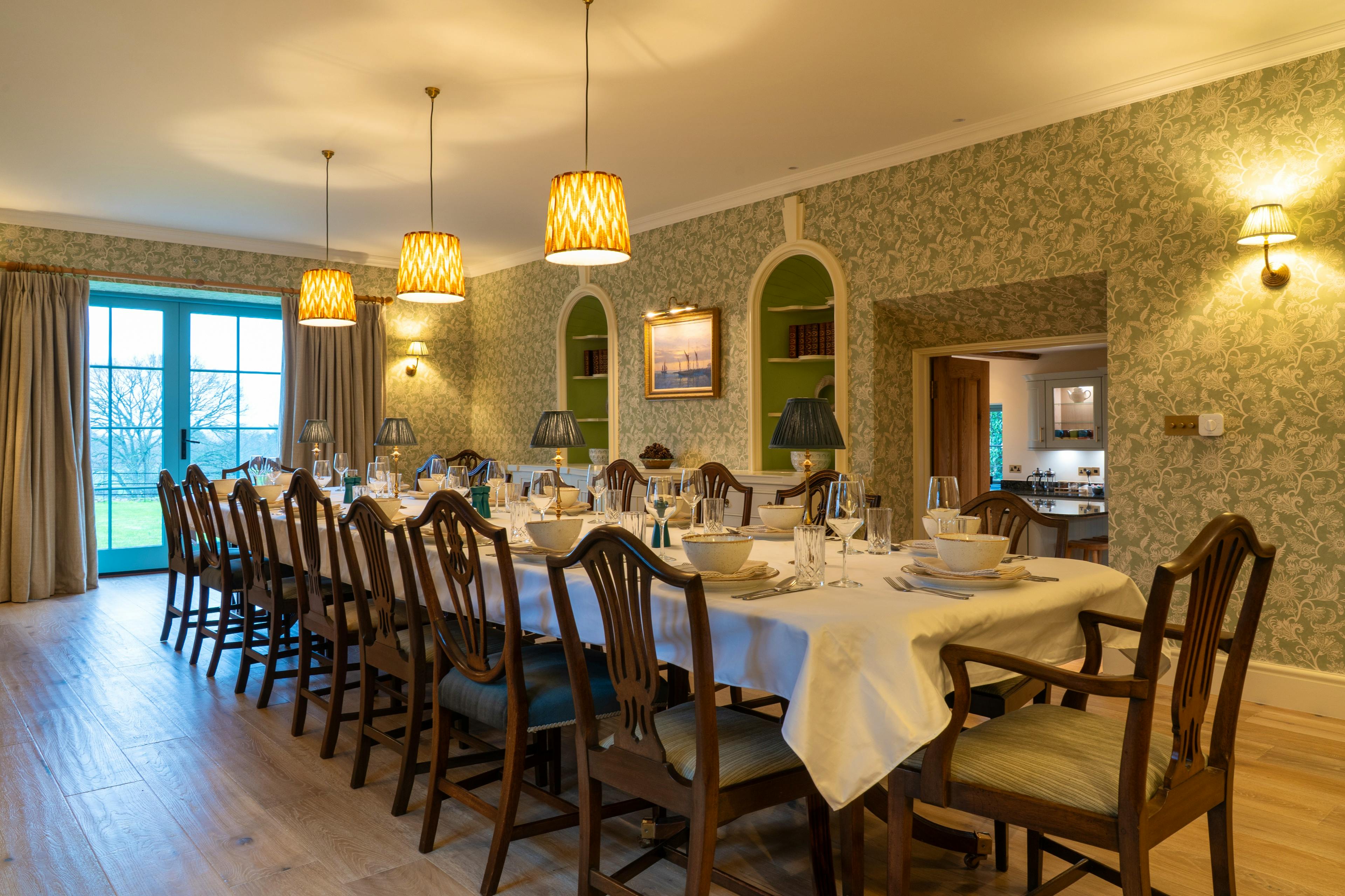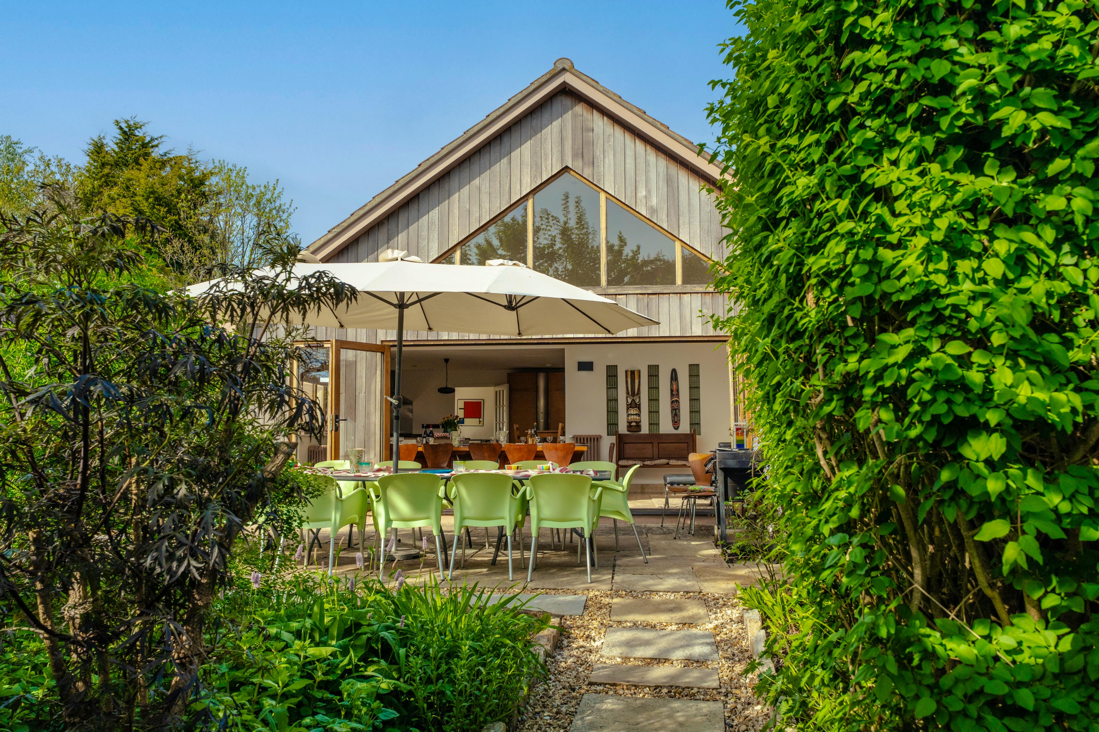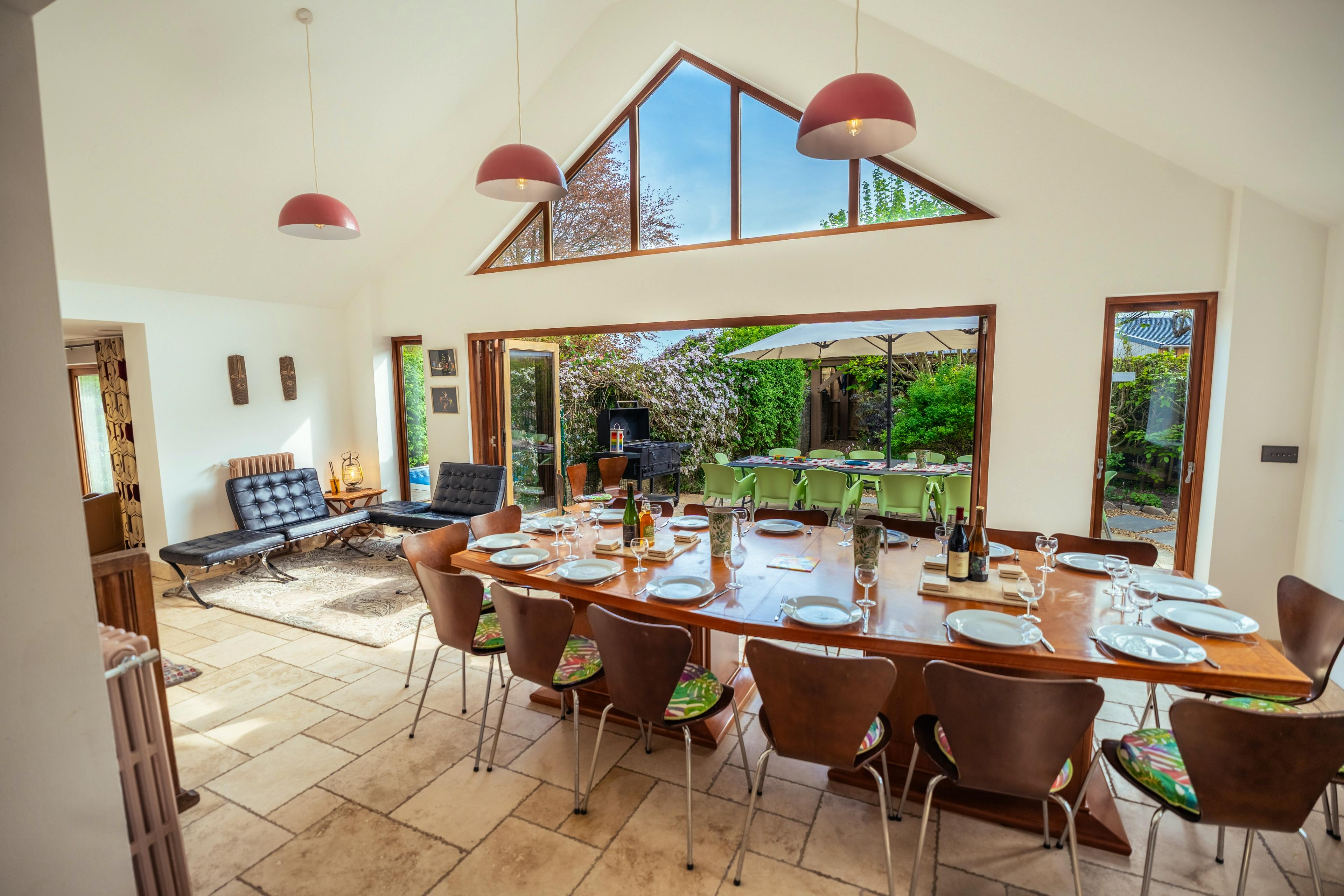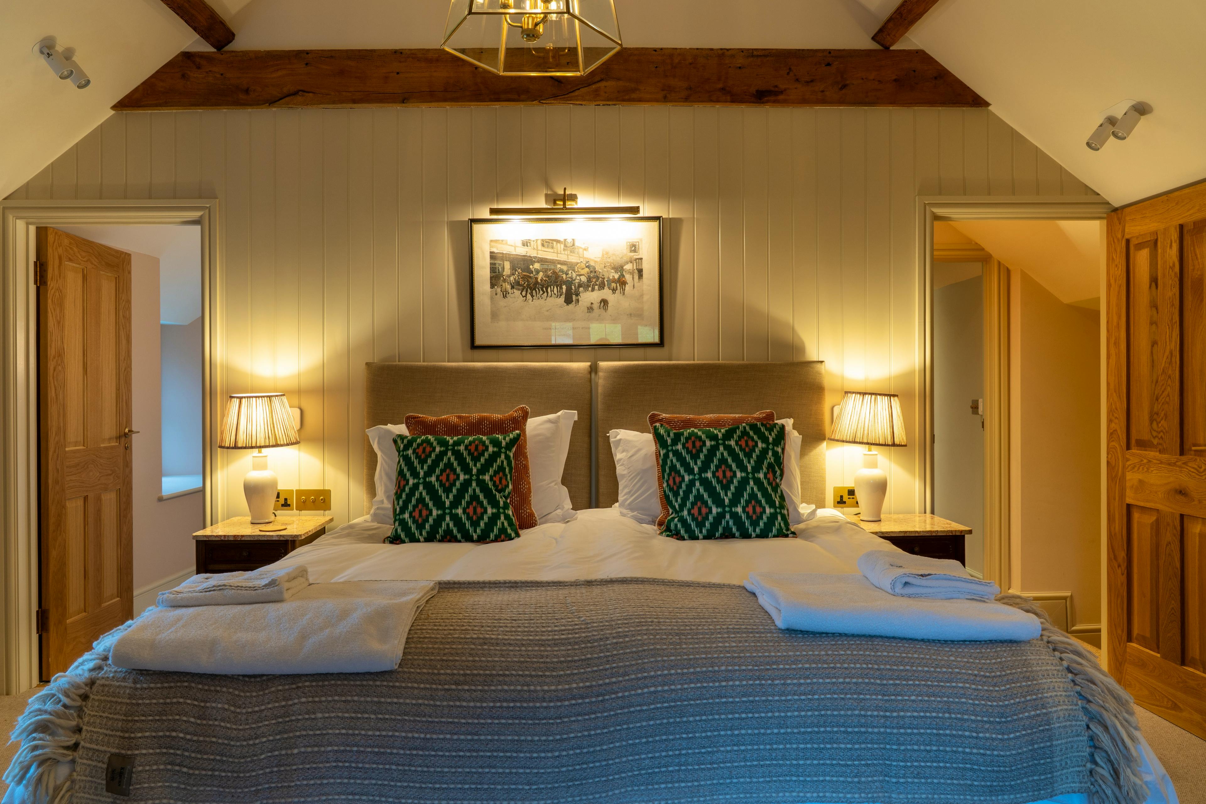 There are six bedrooms, all with ensuite bathrooms and these can be set up with the configuration of single and super-king size beds that best suits your group, offering plenty of flexibility. The main bedroom has its own set of bifold doors looking out onto the orchard and has a little seating area just outside, perfect for a quiet coffee in the morning as you listen to the birds or a cocktail in the evening.