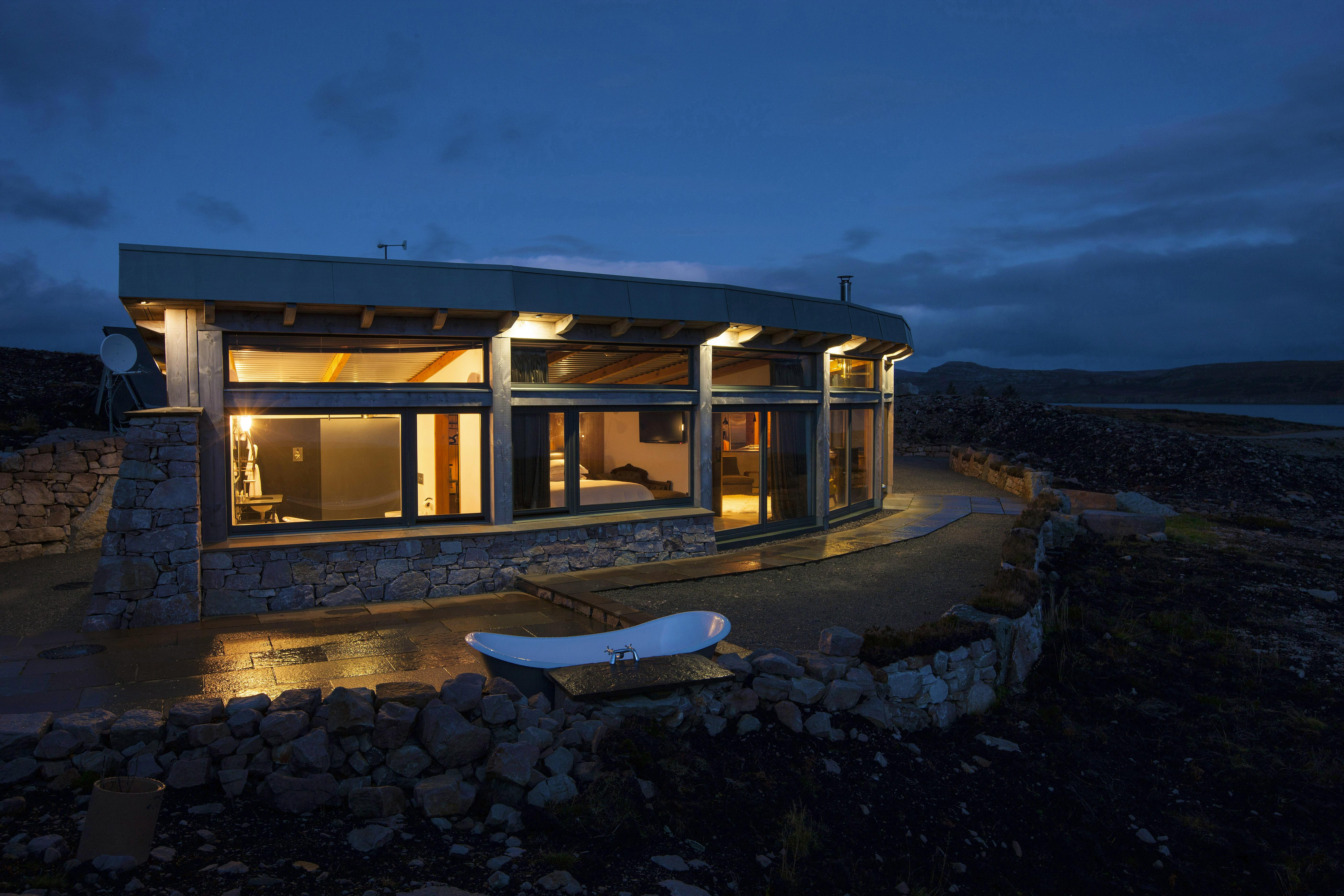 The curved stone house is a spacious two bedroom property with a double bedroom with en-suite and a second twin or double bedroom with a second shower room and WC. Features include a luxury freestanding bath and spacious sauna with double drench-head shower. The large open plan kitchen/dining and living areas create a spacious, modern space with stunning views from the floor to ceiling windows. The house has a spacious, south westerly facing spill out area and panoramic windows, from which you can view the dramatic West Highland vistas and sunsets out across the Summer Isles.