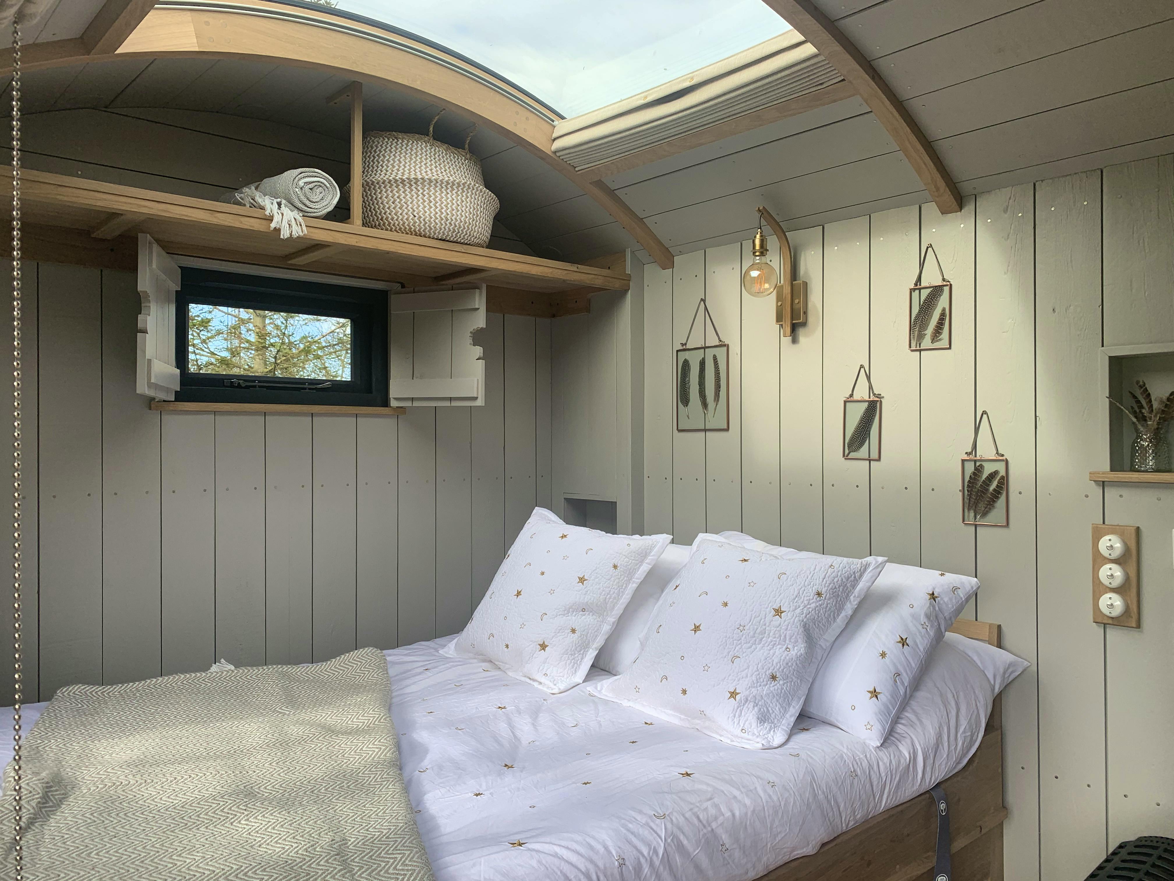 Step inside and you’ll find that this small but mighty hideaway has everything you could wish for. The Whisp may be compact, but it’s filled with warmth, character and charm. There’s a plush double bed dressed in soft linens, a rustic-style shower room, a cute kitchenette with an induction hob and coffee machine and a pair of irresistible armchairs perfect for curling up with a book. A wood burner keeps things toasty on cooler nights, while thoughtful details like cosy throws, soft lighting and 100 Acre toiletries make every moment feel indulgent.