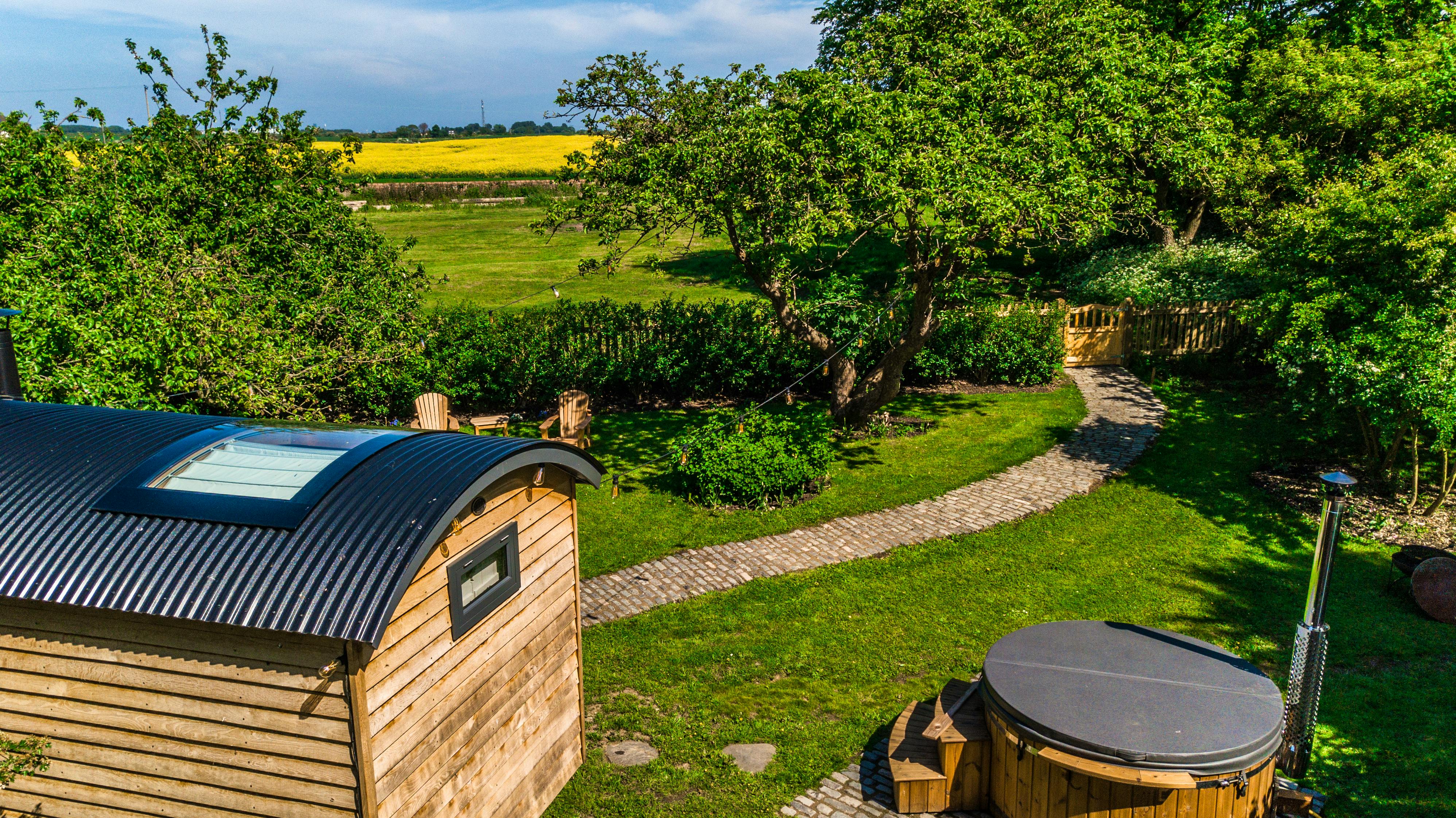 Romantic countryside shepherd’s hut with hot tub and firepit in peaceful Lincolnshire.