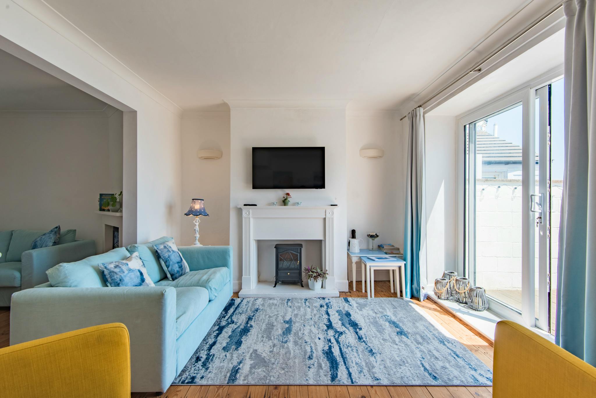 Get comfy in the stylish sitting room, which features double aspect windows, providing an abundance of natural light, and is furnished with comfortable seating for up to four people. A cosy wood-burning stove adds warmth to the room and a coffee table sits at its centre, making it a perfect space for relaxation.