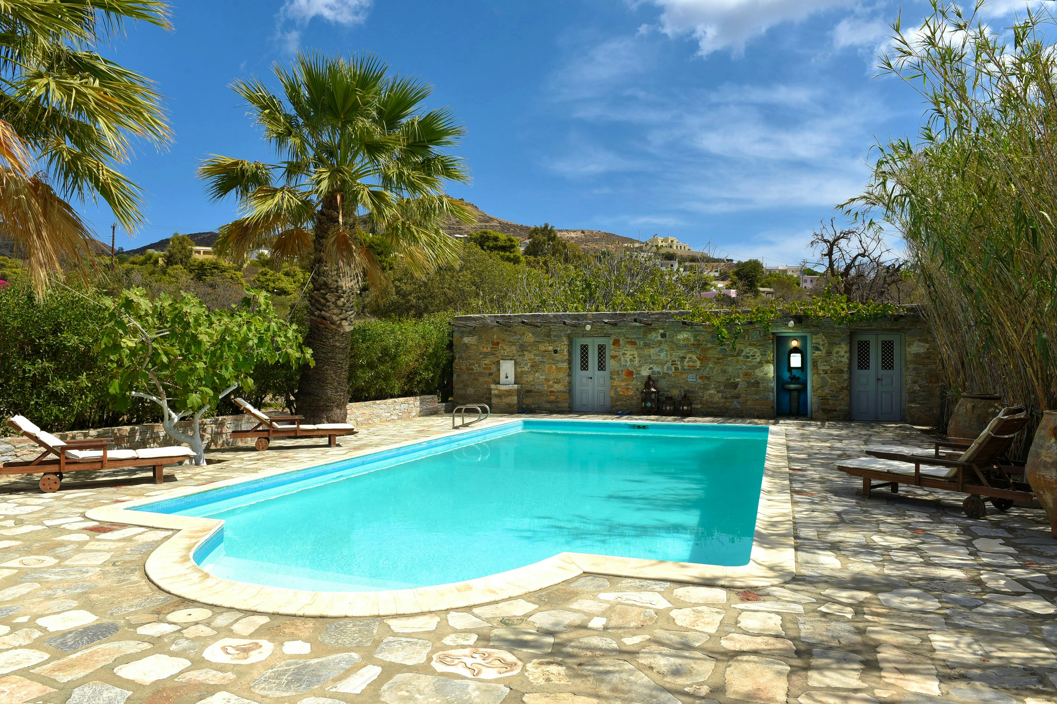 Each cottage has been renovated sympathetically and in-keeping with its surroundings The interiors have been decorated and furnished to a high standard in classic blues and whites, while touches such as hand carved limestone basins ensure the character of these lovely habitats is retained. Pale blue wooden shutters, cool stone floors and timber ceilings painted white recur throughout all the cottages all enhancing the character and giving it an archetypical Greek dwelling atmosphere.