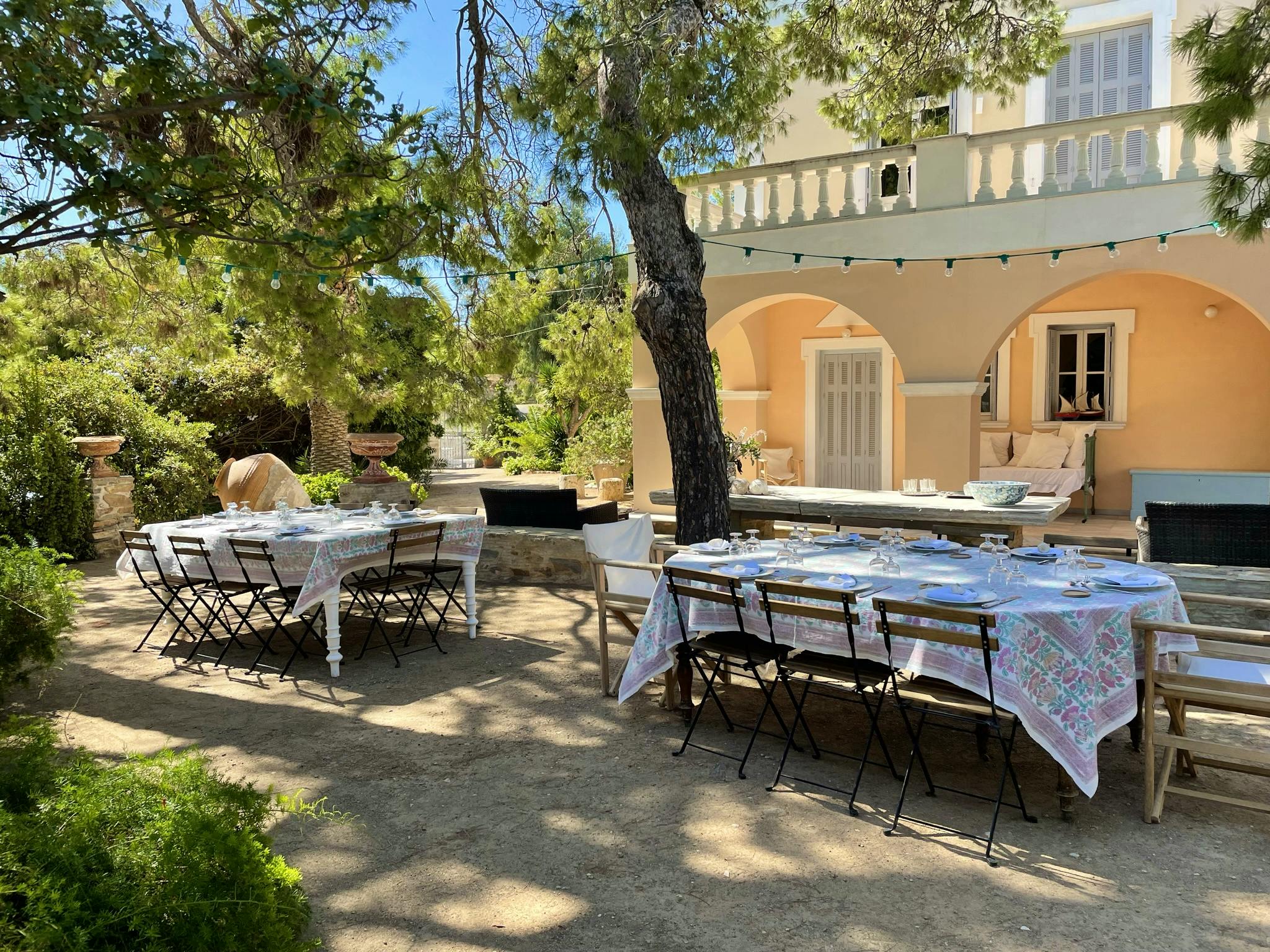 The bathrooms feature rainfall showers and double basins, as well as comfy towels, bathrobes and linens all of which are of a high quality. The living areas are light and cool, and large, deep sofas make a great place for a post-lunch siesta out of the midday sun. There is a well-equipped kitchen which boasts two large fridges, as well as a kitchen dining table large enough for lively breakfasts and long wine-fuelled dinners.